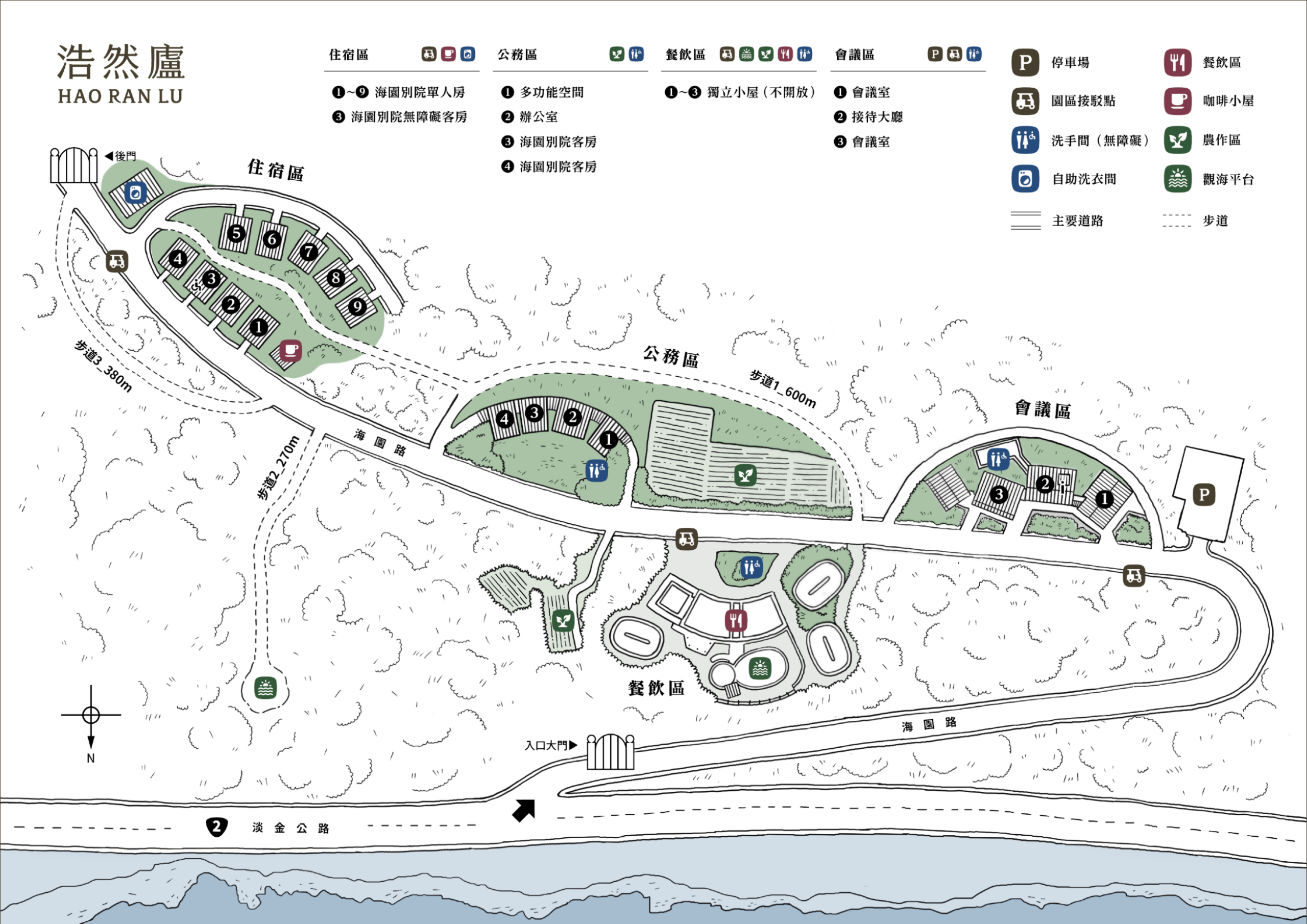 浩然廬初建於1970 年,原本只有四棟白色建築物,以會議研習為核心兼顧環境保育的開發理念,逐步構築相關的設施與建築。歷經數十年的慢工,勾勒出一個結合會議研習與教育訓練、餐飲與住宿、休閒農場,讓人們在海風山林之間研習、沉澱、與成長的多功能園區。